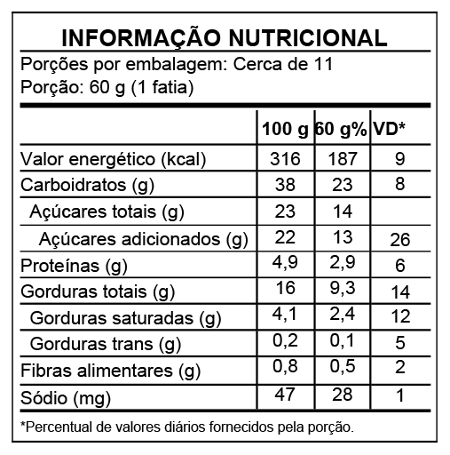 Leite integral, açúcar cristal, ovo, farinha de milho em flocos, milho, óleo de soja, queijo minas meia cura (leite pasteurizado integral, fermento lático, cloreto de sódio, cloreto de cálcio (INS 509), corante natural de urucum (INS 160b), coagulante quimosina), coco em flocos, fermento químico em pó.