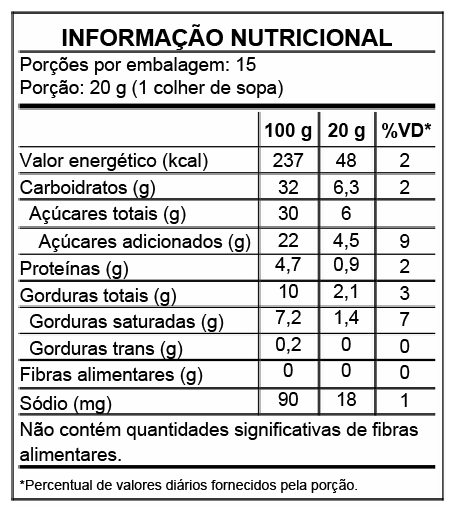 Creme de leite (creme de leite pasteurizado, leite pasteurizado integral, leite em pó integral, espessante (celulose microcristlina, carboximetilcelulose e carragena), estabilizantes citrato de sódio, tripolifosfato de sódio e monofosfato monossódico), leite condensado (leite semidesnatado, açúcar e lactose), lactose), leite em pó. ALÉRGICOS: CONTÉM LEITE E DERIVADOS. PODE CONTER SOJA. CONTÉM LACTOSE. CONTÉM GLÚTEN.