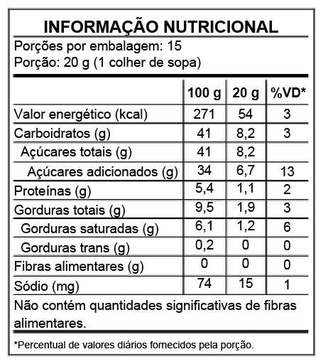 Doce de leite (leite integral, açúcar, glucose de milho, amido modificado, regulador de acidez bicarbonato de sódio e conservante sorbato de potássio), creme de leite (creme de leite pasteurizado, leite pasteurizado integral, leite em pó integral, espessante (celulose microcristlina, carboximetilcelulose e carragena), estabilizantes citrato de sódio, tripolifosfato de sódio e monofosfato monossódico). ALÉRGICOS: CONTÉM LEITE E DERIVADOS. PODE CONTER AMENDOIM E SOJA. CONTÉM LACTOSE. CONTÉM GLÚTEN.