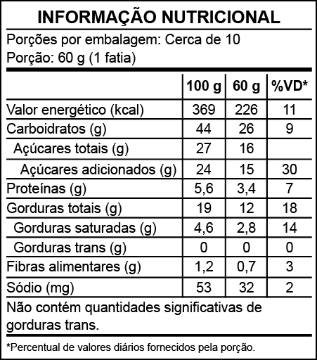 Ingredientes: Farinha de trigo enriquecida com ferro e ácido fólico, óleo de soja, água, açúcar cristal, ovos, chocolate em pó 50% cacau, fermento químico em pó. Cobertura (creme de leite, leite condensado, polpa de maracujá). Geleia (polpa de maracujá, água, açúcar cristal). ALÉRGICOS: CONTÉM OVOS, TRIGO, LEITE E DERIVADOS. CONTÉM DERIVADOS DE SOJA. PODE CONTER AVEIA, CENTEIO, CEVADA E TRITICALE. CONTÉM LACTOSE. CONTÉM GLÚTEN.
