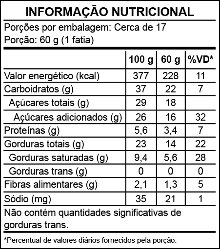 Ingredientes: Farinha de trigo enriquecida com ferro e ácido fólico, óleo de soja, água, açúcar cristal, ovo, chocolate em pó 50% cacau, chocolate ao leite (água, óleo vegetal, açúcar), creme de leite, amendoim torrado, creme de avelã (açúcar, óleo vegetal de palma, avelãs, leite desnatado em pó, cacau em pó