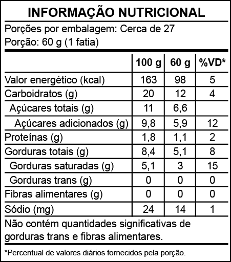 Ingredientes: Abacaxi, cobertura chocolate branco (açúcar, gordura vegetal, leite integral em pó, emulsificantes: lecitina de soja e ésteres de ácido ricinoléico interesterificado com poliglicerol e aromatizante), creme de leite, chantilly, leite em pó integral, açúcar cristal, farinha de trigo enriquecida com